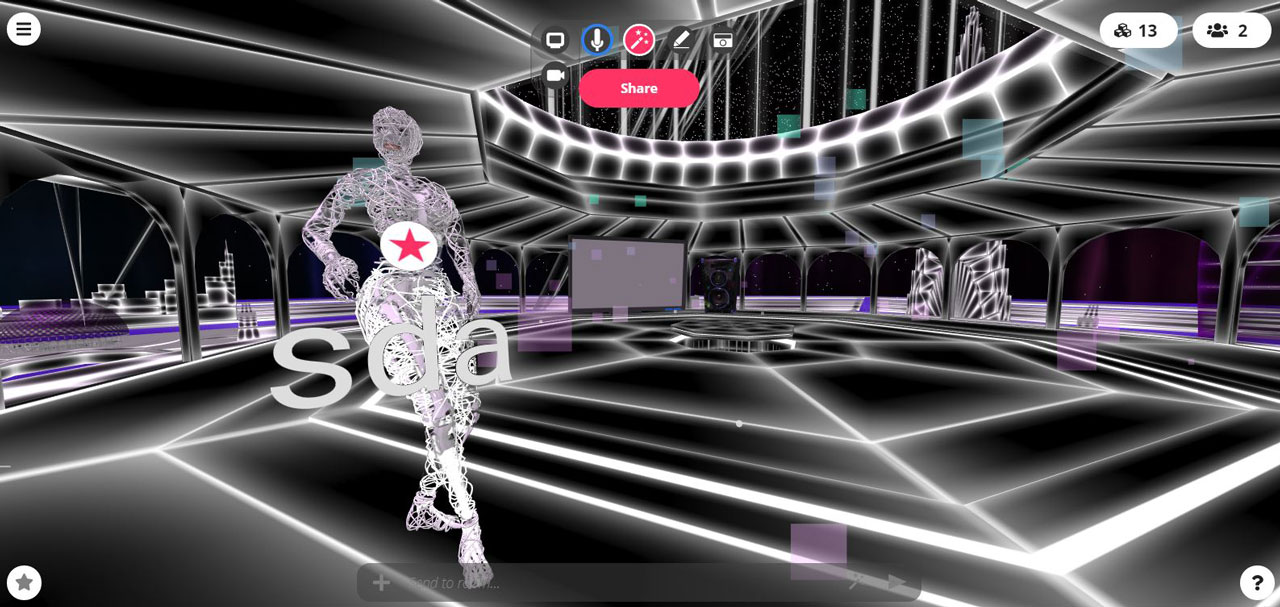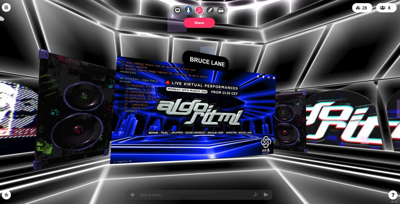 algo:ritmi is a 3D virtual club in which artists can perform by streaming their music/visuals/art and interact with the audience with chat and voice.