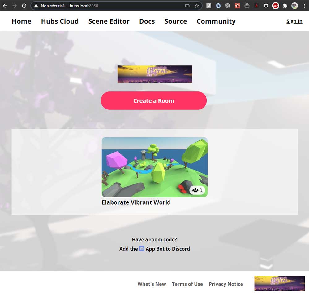 Open https://hubs.local:8080/ in your browser, accept the insecure website warning and Create your first room !